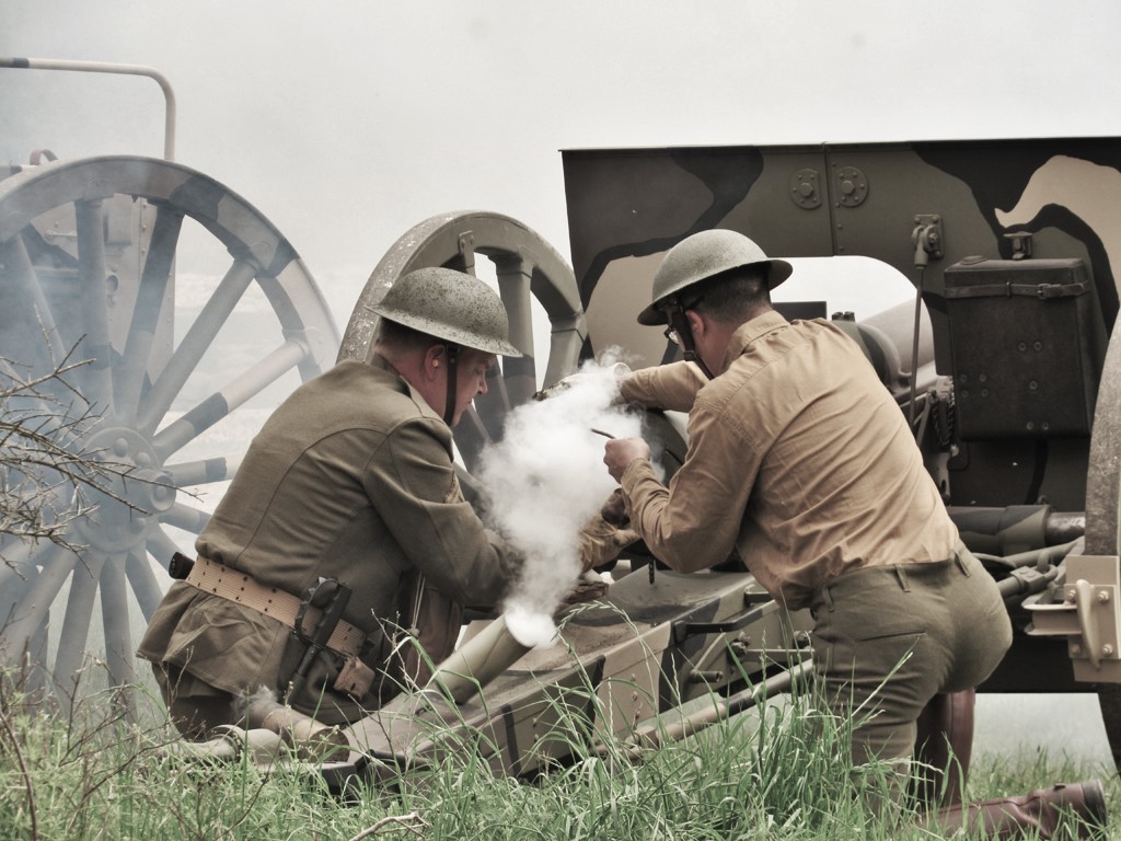 A couple of my heathens at the last WWI reenactment. The gun is a restored French M1897 field gun in 75mm. The spoked wheel to the immediate left is its ammunition caisson, and what you can't see through the smoke is the Nash Quad that dragged it all up the hill for the show, the museum's reconstructed trench network and infantry within, or a fairly rare operable Renault FT-17 tank (in which another of my heathens got to ride as gunner).