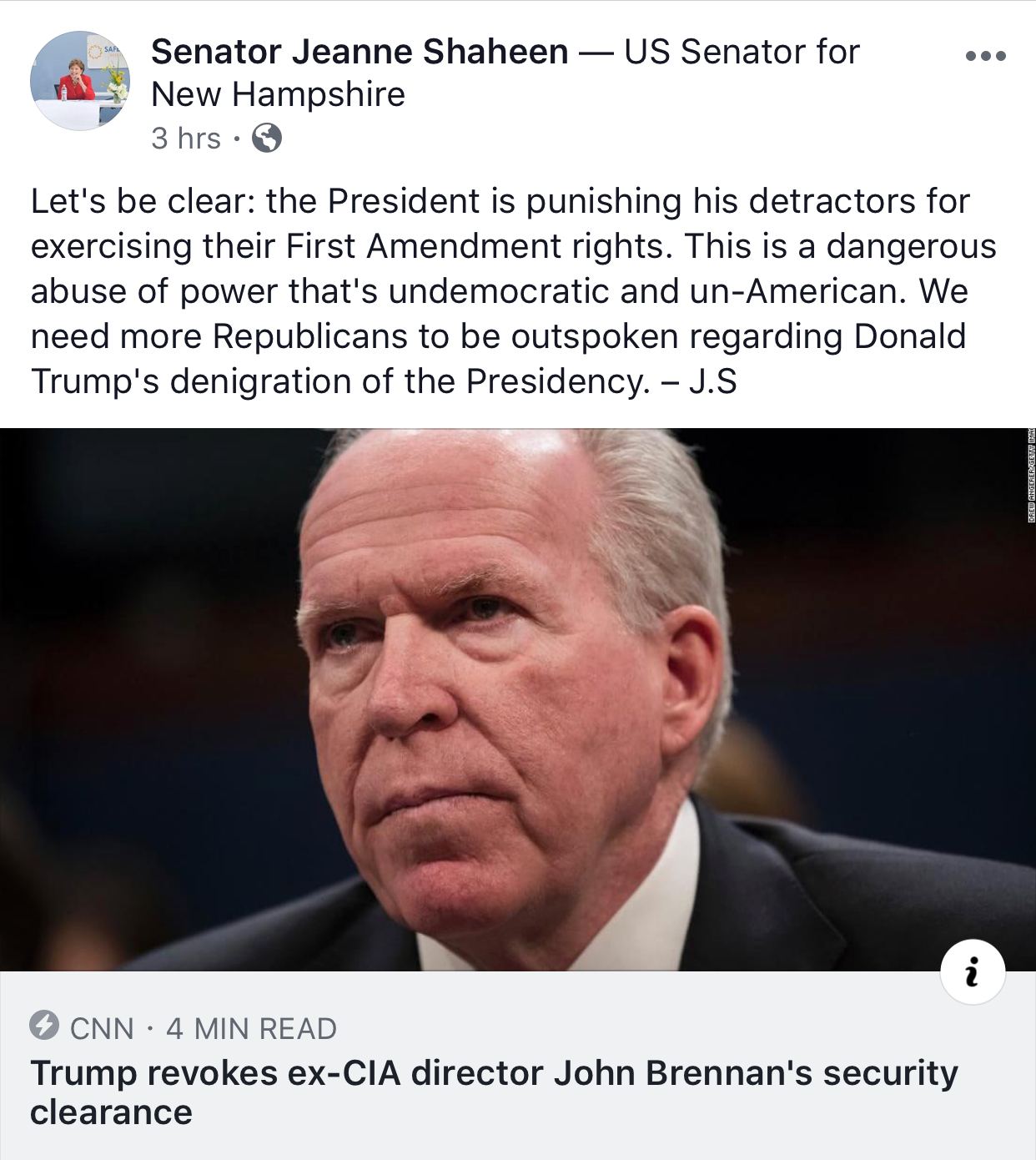 The screenshot above is from Senator Shaheen's Facebook post, the very same woman who has a "hit list" of her own, an enemies list of people whom she would silence in the media who have criticized her on numerous occasions.